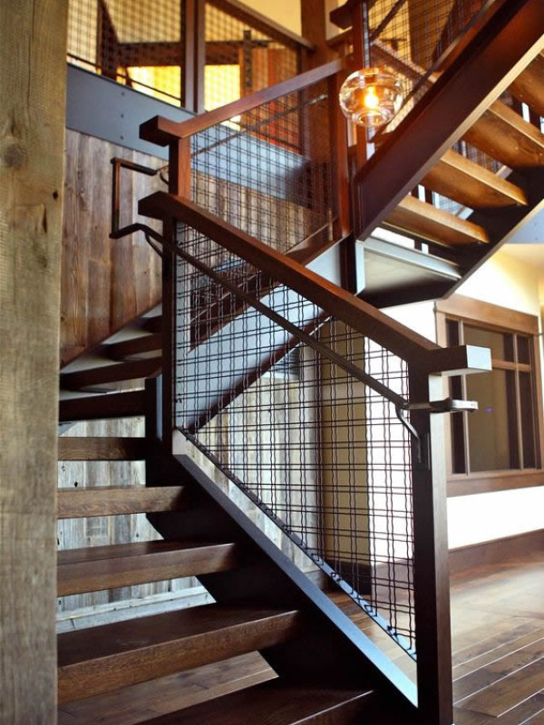Современная лестница должна быть не только стильной, но и безопасной. Комбинация металла и дерева – это оптимальный выбор для установки в частном доме. Ограждение Лофт 12 полностью соответствует требованиям безопасности. Стоит обратить внимание на исполнение такого элемента как поручни. В данной модели деревянный поручень на стандартной высоте дублируется тонким изящным металлическим поручнем на протяжении всего ограждения. Между пролетами лестницы поручень не прерывается, а переходит на следующий уровень вертикальной стойкой, за которую удобно ухватиться при подъёме наверх. Модули ограждения представлены прямоугольными деревянными стойками, между которыми зафиксированы сетки с необычным двойным квадратным узором.